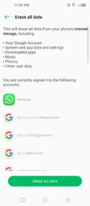 Step 6 : अब आपकी Google Account और अन्य अकाउंट दिखेगी इसलिए दोबारा कन्फर्म करने के लिए आपको वापिस Erase Data पर क्लिक करना हैं।